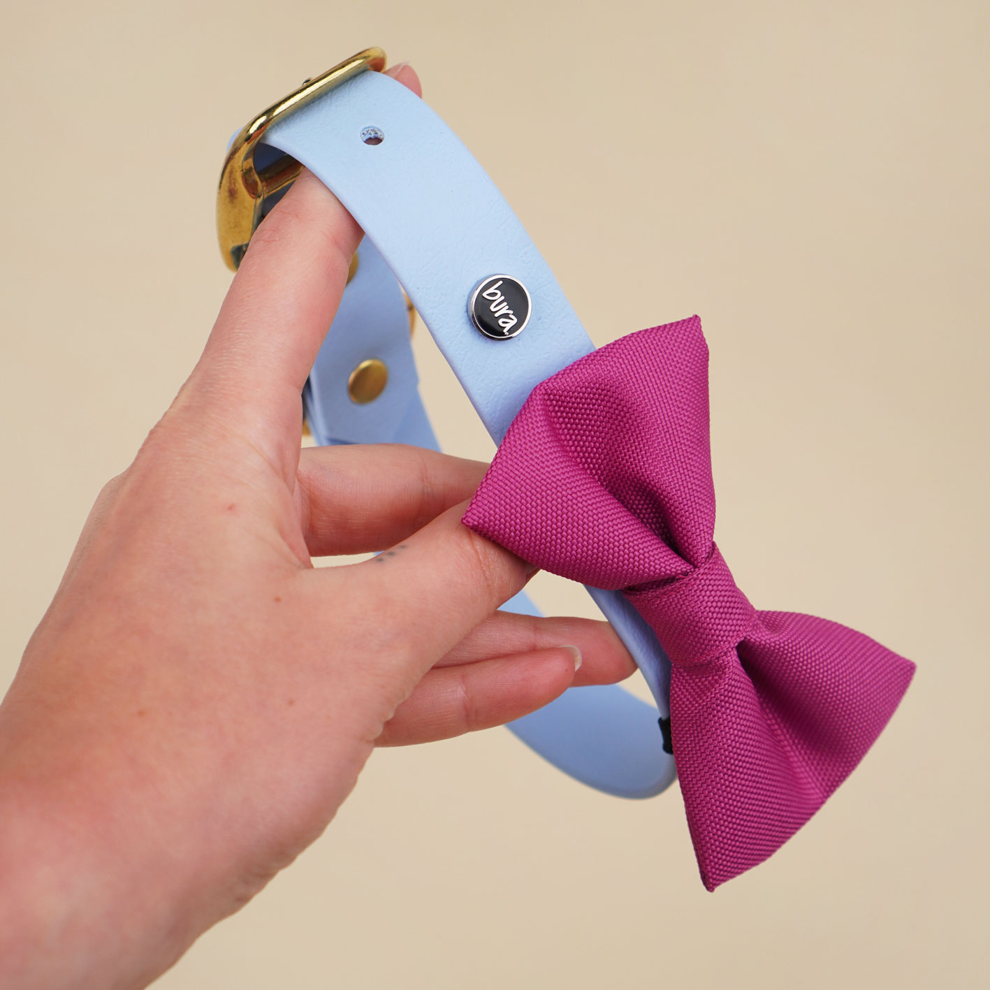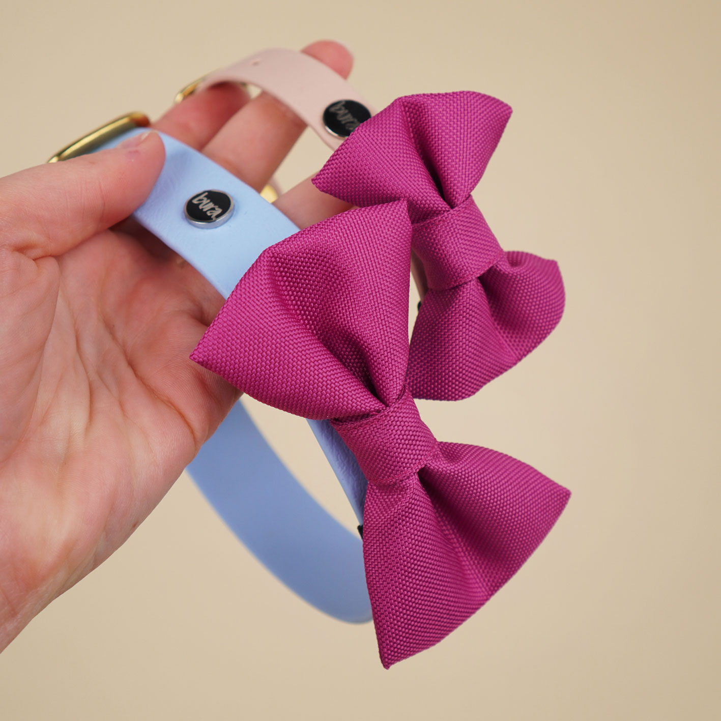 Kokarda dostępna jest w kolorze magenty – klasycznym, eleganckim i bardzo wyrazistym. Idealnie łączy się z obrożami z Biothane oraz dodatkami Bura: etui na kupoworki, saszetkami na smaczki czy innymi akcesoriami z tego samego zestawu. Jeśli lubisz spacerowe matchy-matchy, ten kolor daje naprawdę dużo możliwości.