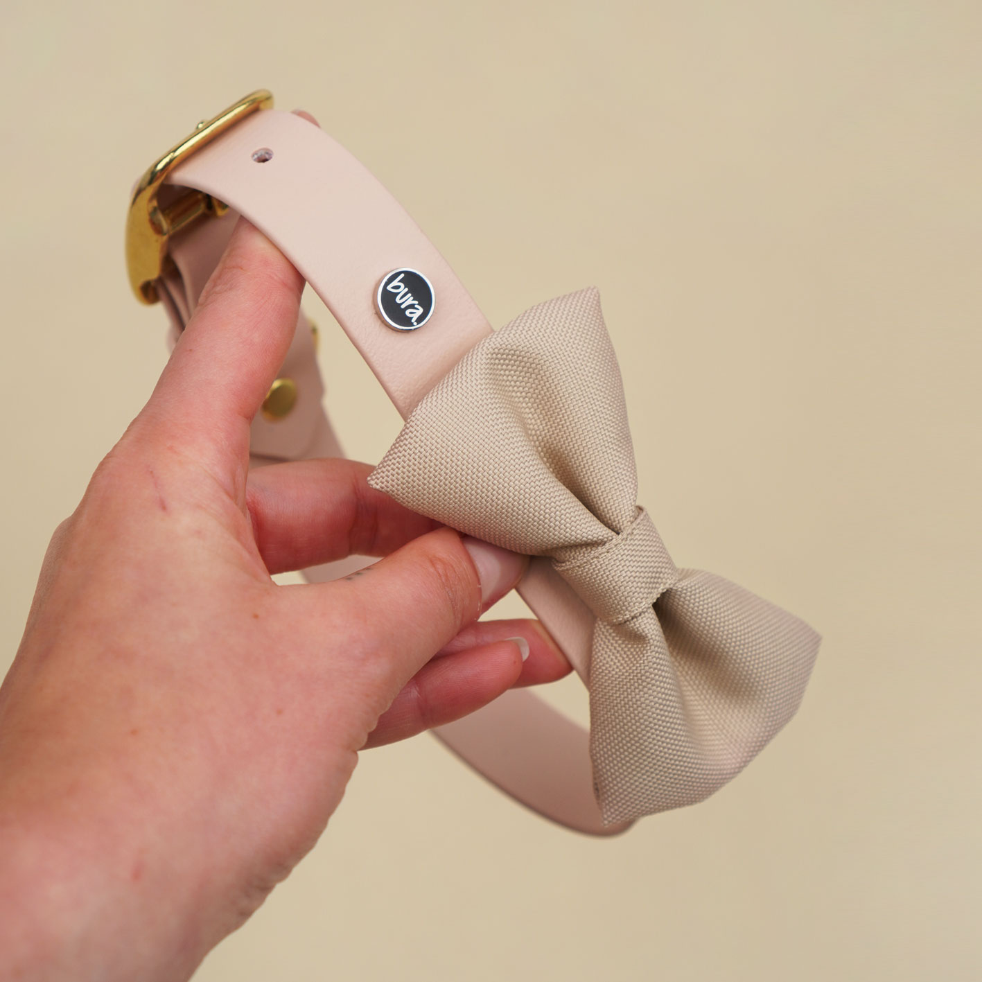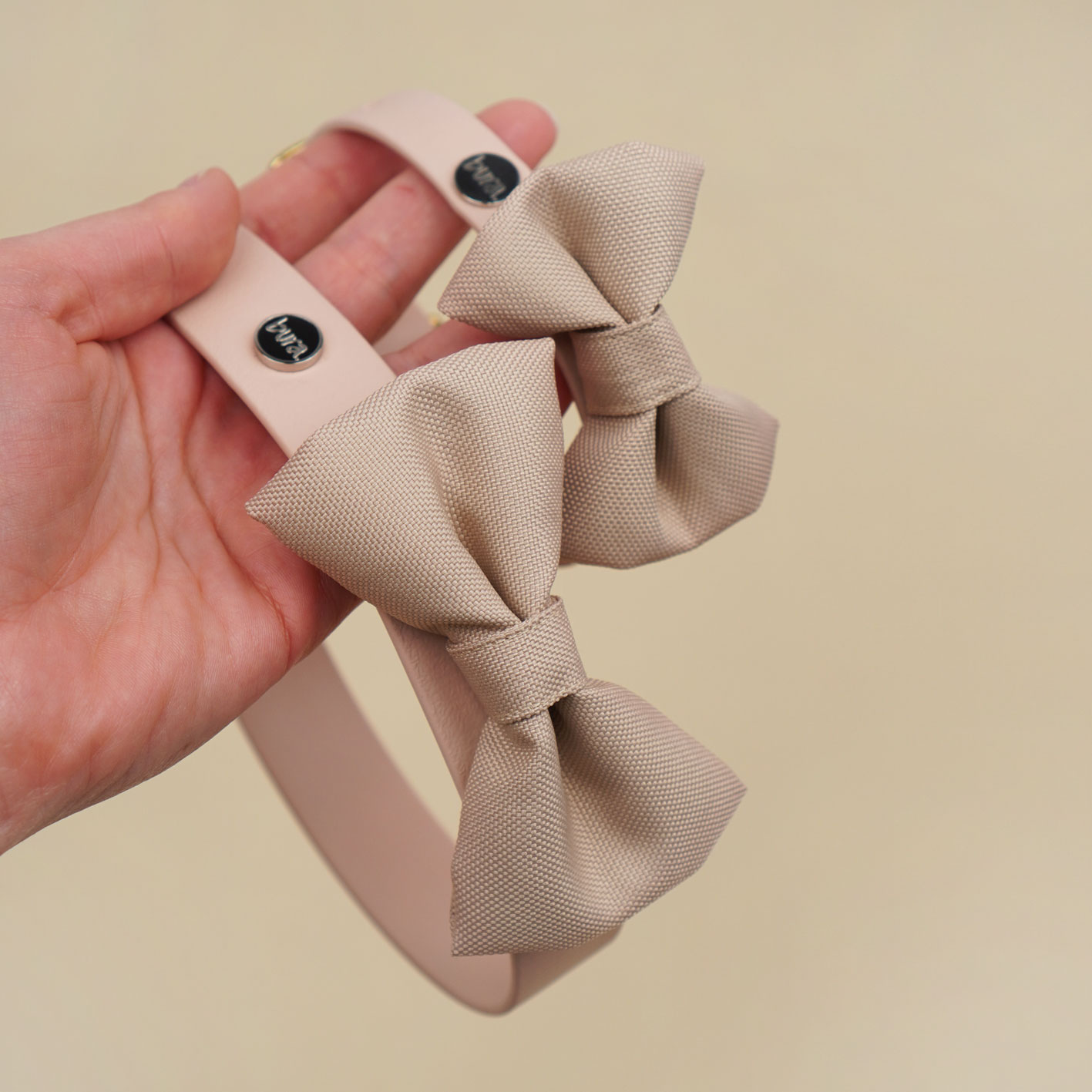Kokarda dostępna jest w kolorze pudrowym – klasycznym, eleganckim i bardzo wyrazistym. Idealnie łączy się z obrożami z Biothane oraz dodatkami Bura: etui na kupoworki, saszetkami na smaczki czy innymi akcesoriami z tego samego zestawu. Jeśli lubisz spacerowe matchy-matchy, ten kolor daje naprawdę dużo możliwości.