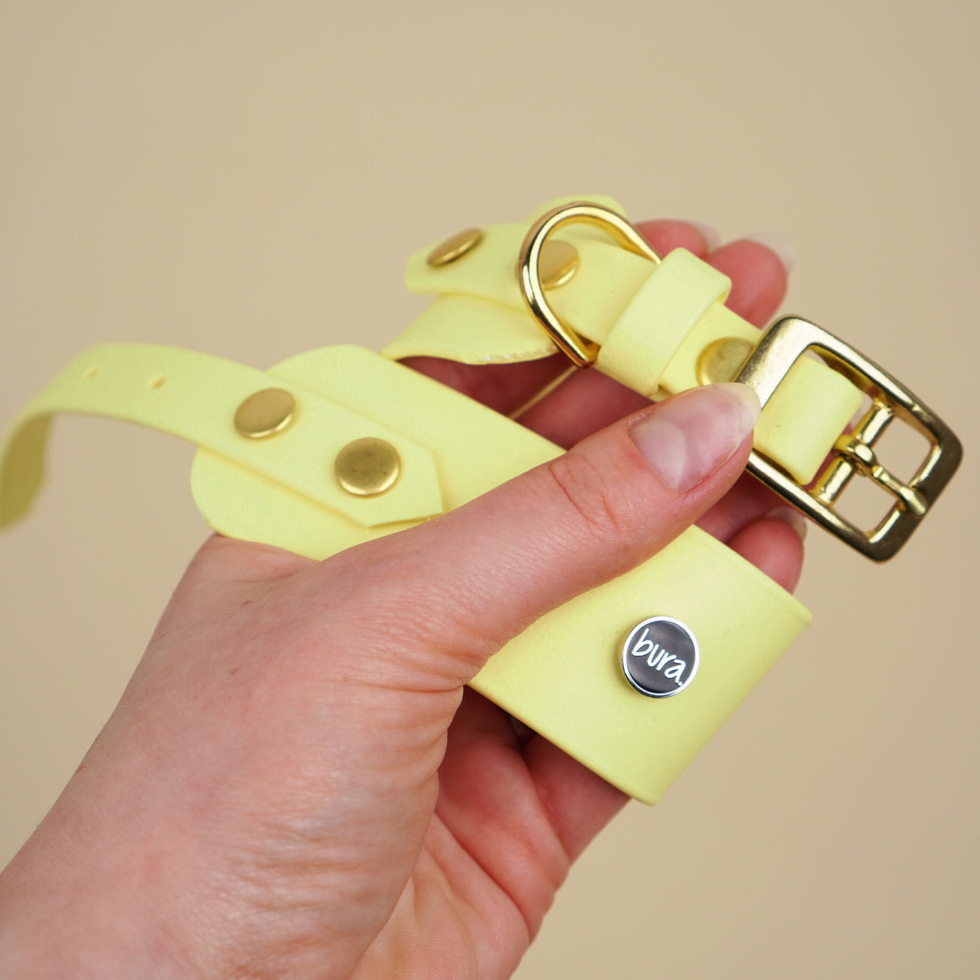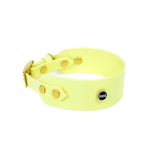 Obroża dla charta z Biothane w kolorze pastelowo-żółtym — szeroka, lekka i wodoodporna. Złote okucia i wygodna sprzączka zapewniają komfort i bezpieczeństwo smukłej szyi.