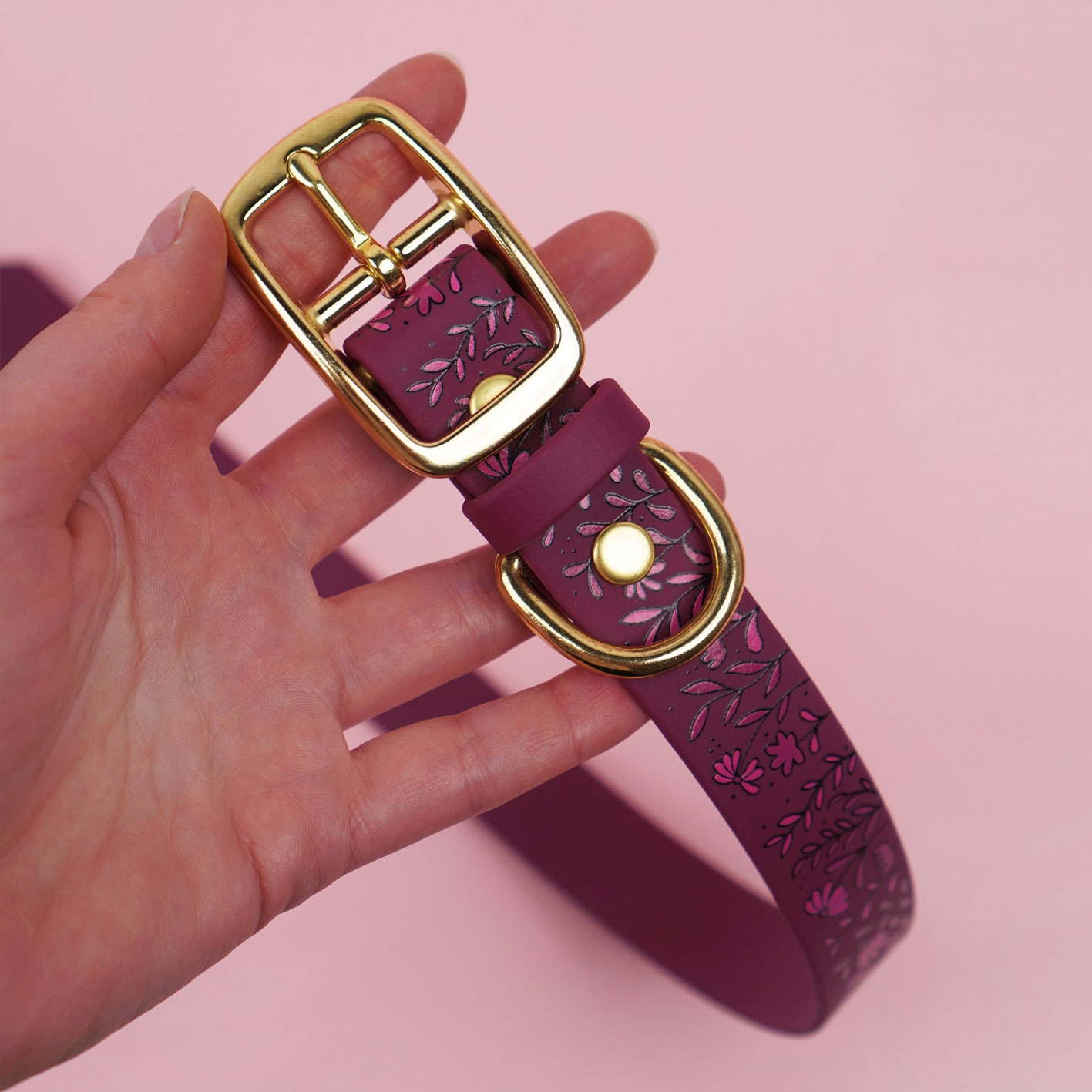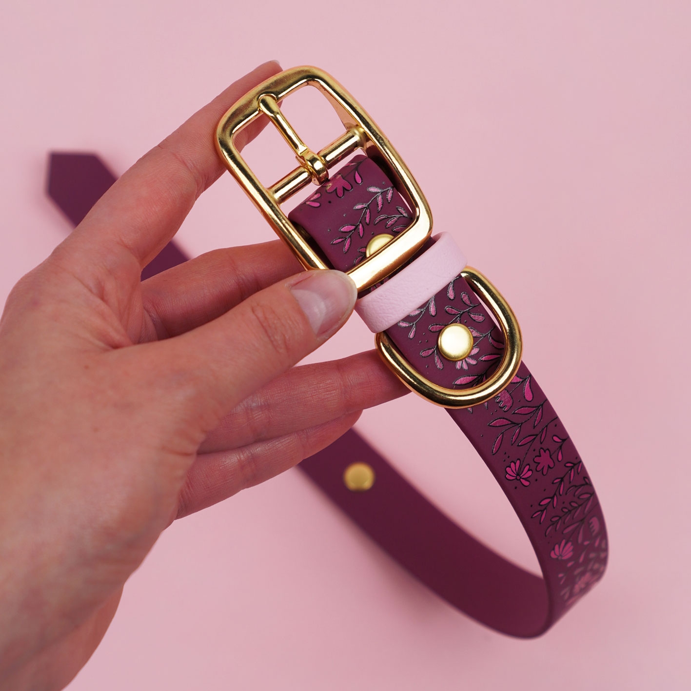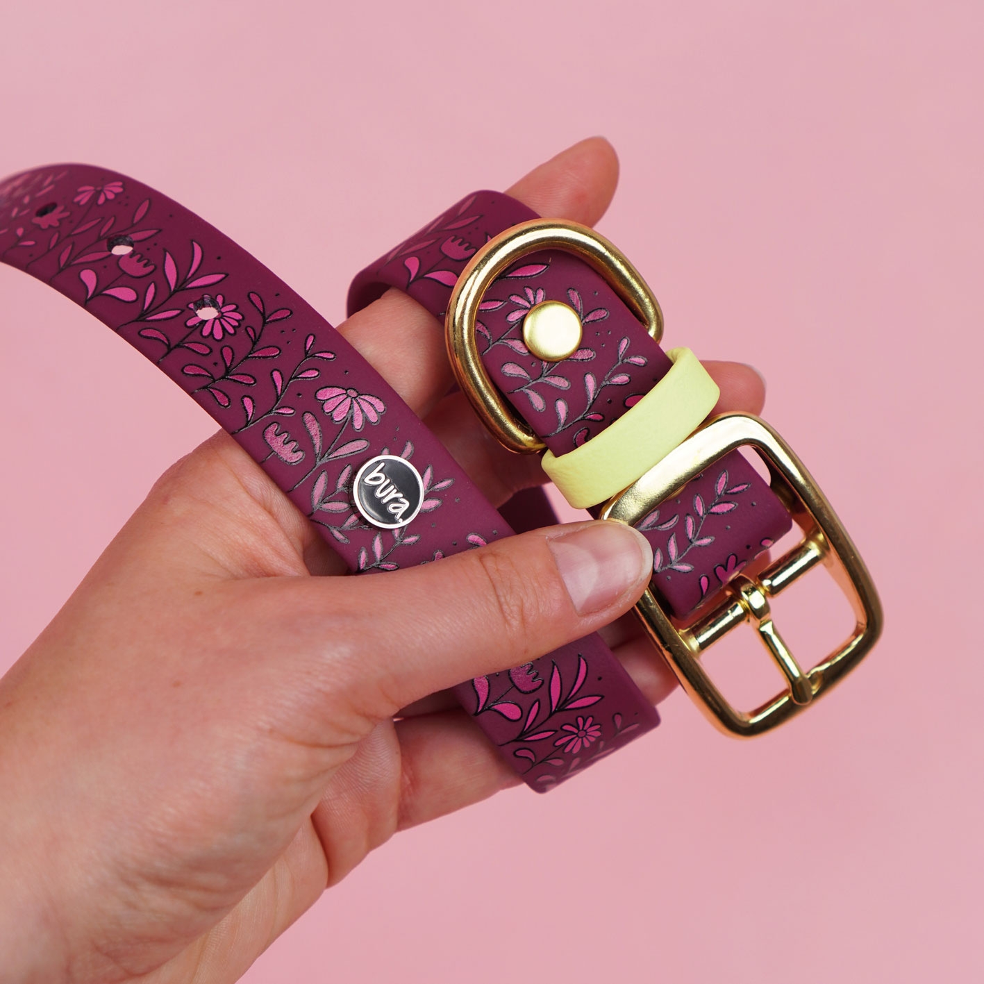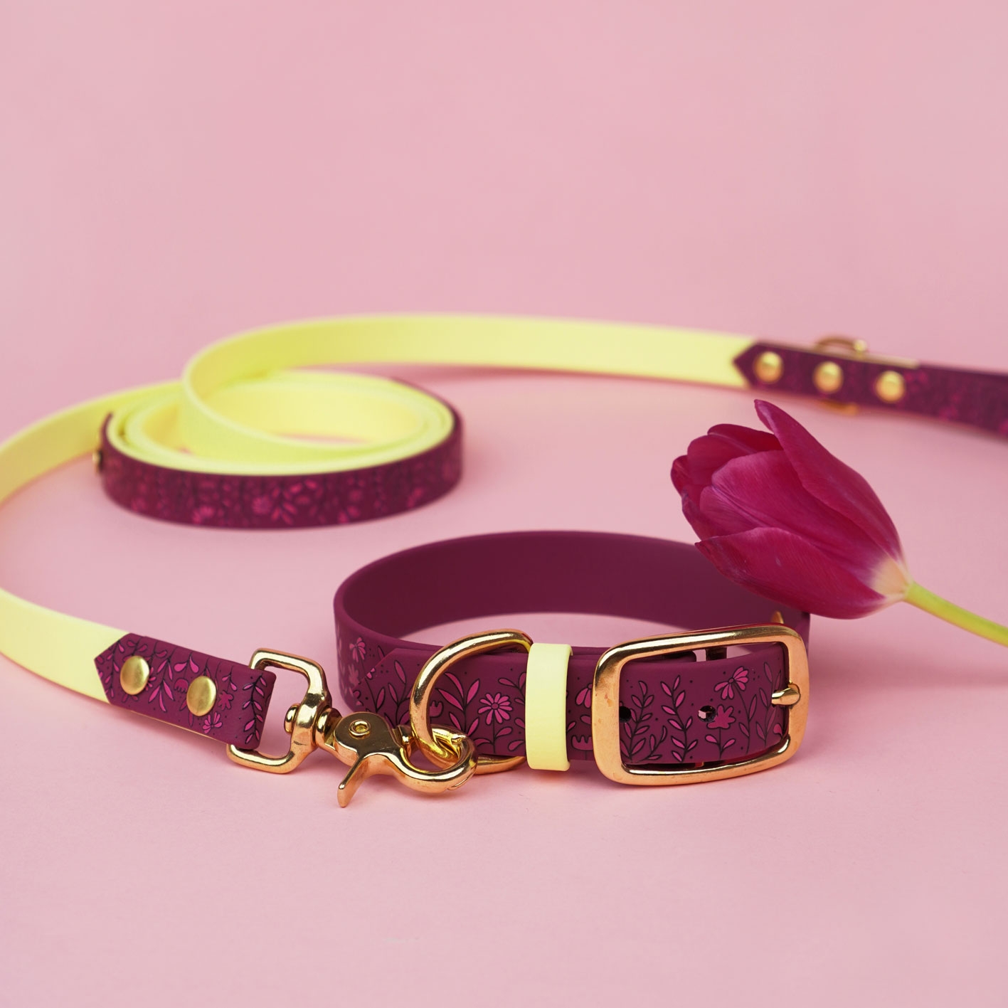 Obroża z Biothane w bordowej odsłonie z autorskim printem Łąka i pastelowo-żółtymi akcentami. Wodoodporna, miękka i łatwa do czyszczenia – gotowa na codzienne spacery i te bardziej wyjątkowe wyjścia. Lekka, wygodna i pełna wiosennego klimatu.