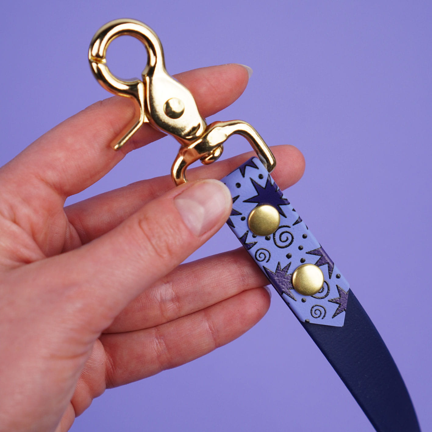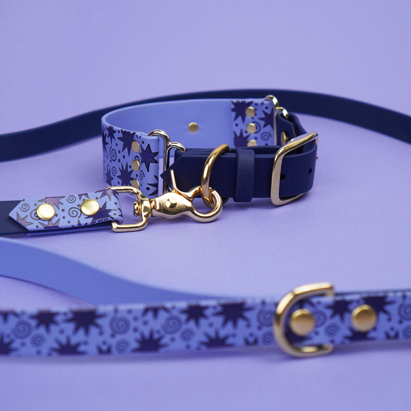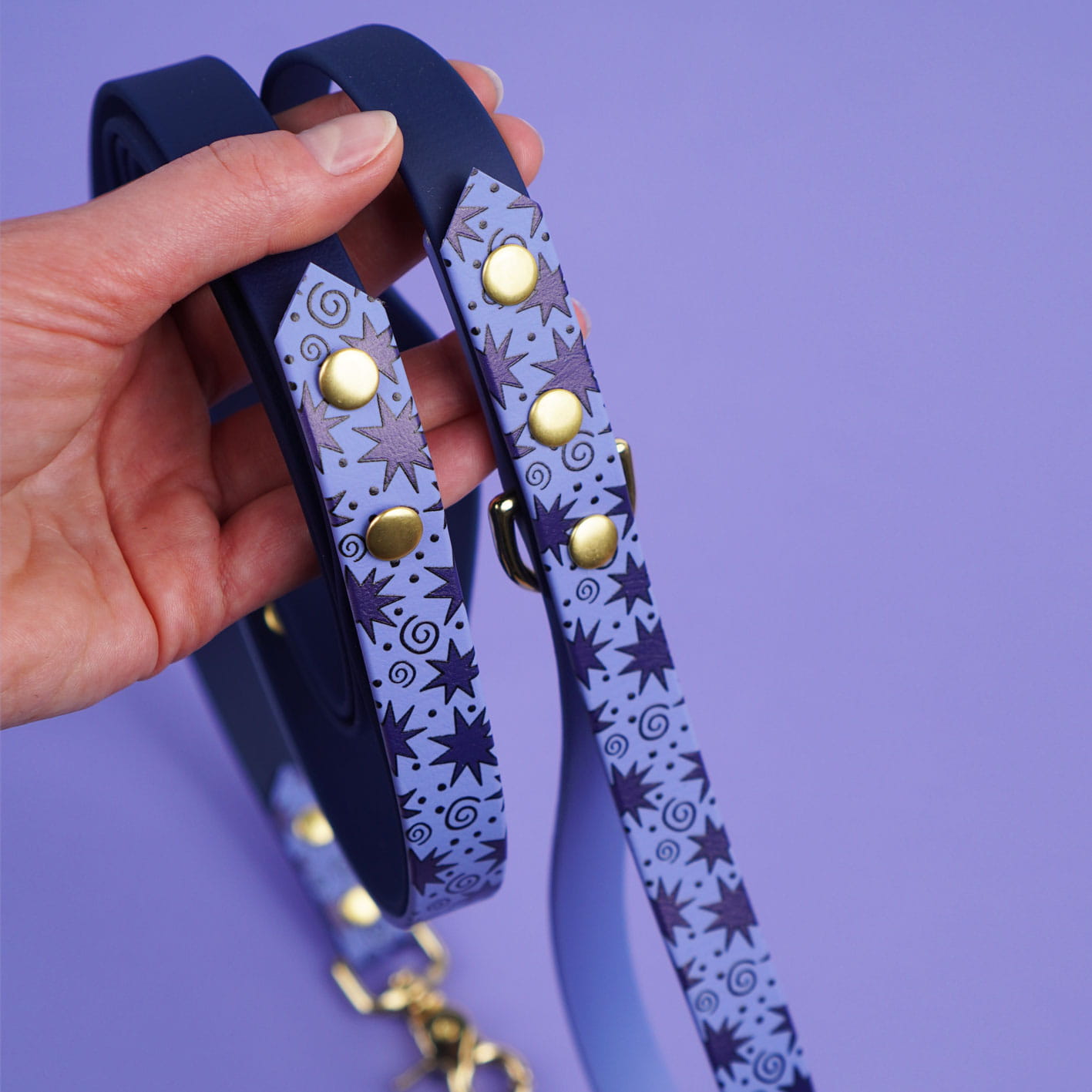 Smycz miejska z Biothane we wzór Gwiazdki – lekka, wodoodporna i zawsze pod ręką. Idealna na codzienne spacery po mieście i szybkie wyjścia z psem. Wygodna, trwała i odporna na każde warunki, a niebiesko-lawendowy połączony z granatem dodaje jej charakteru w każdym otoczeniu.