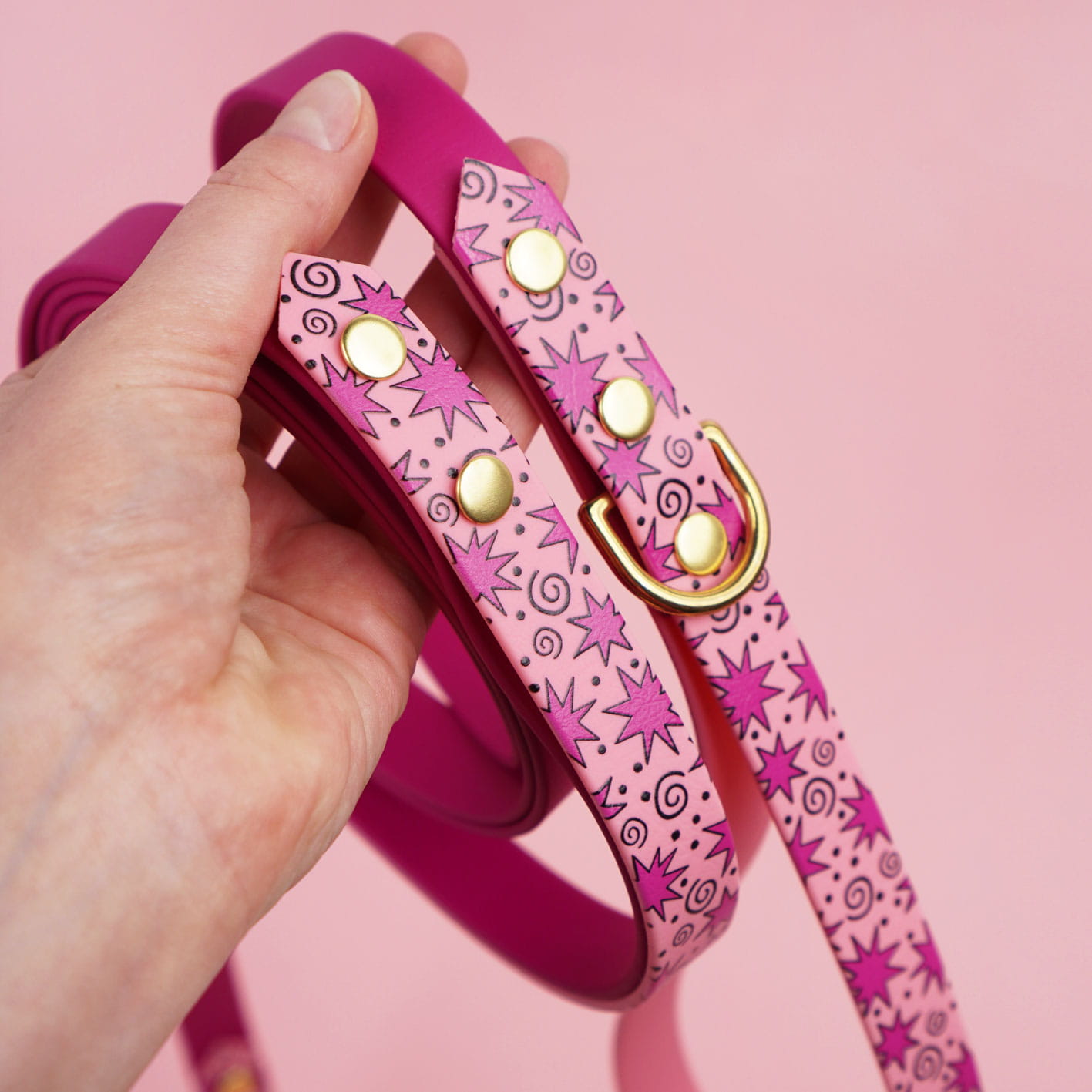 Smycz miejska z Biothane we wzór Gwiazdki – lekka, wodoodporna i zawsze pod ręką. Idealna na codzienne spacery po mieście i szybkie wyjścia z psem. Wygodna, trwała i odporna na każde warunki, a pastelowy róż połączony z magentą dodaje jej charakteru w każdym otoczeniu.