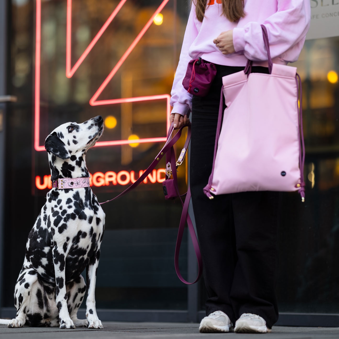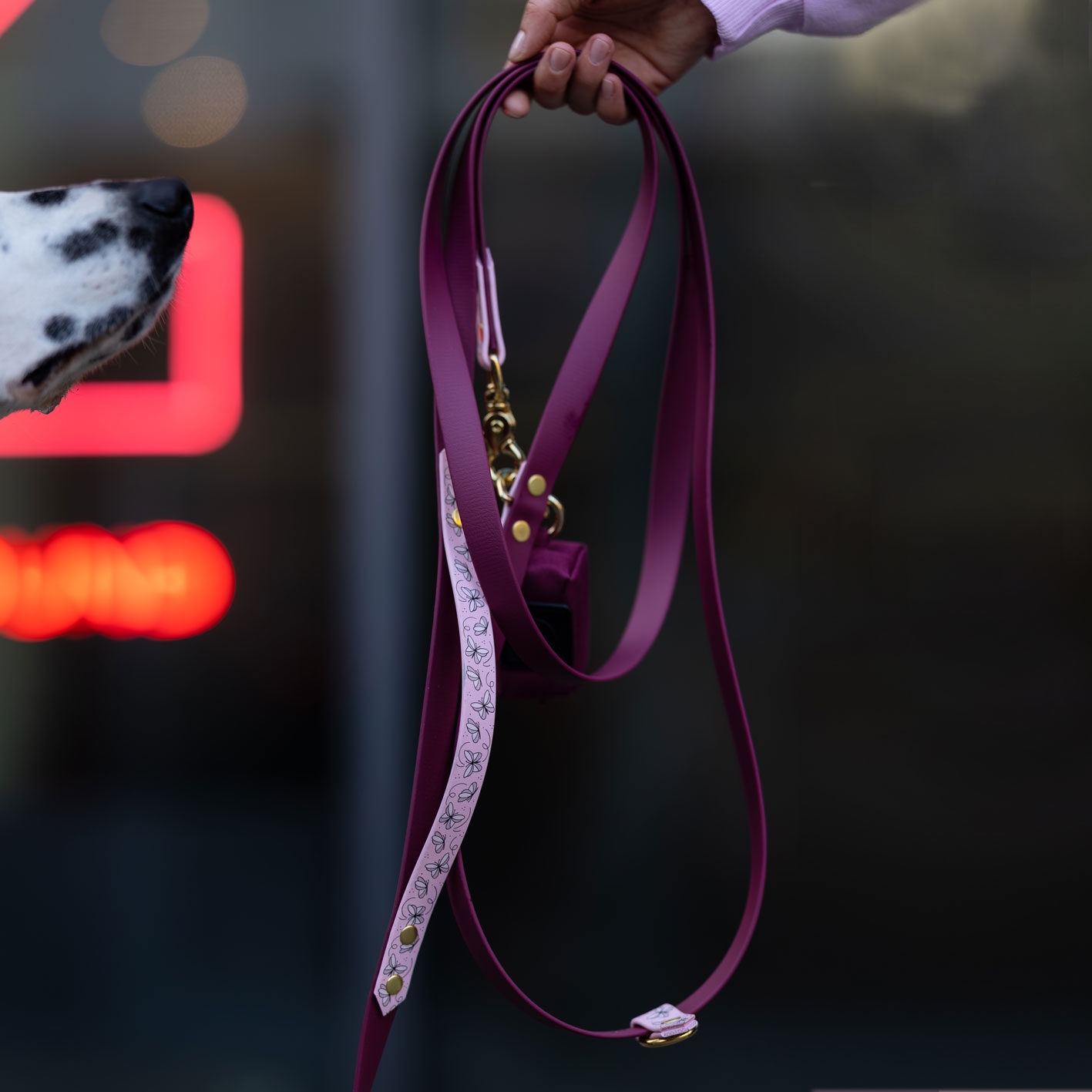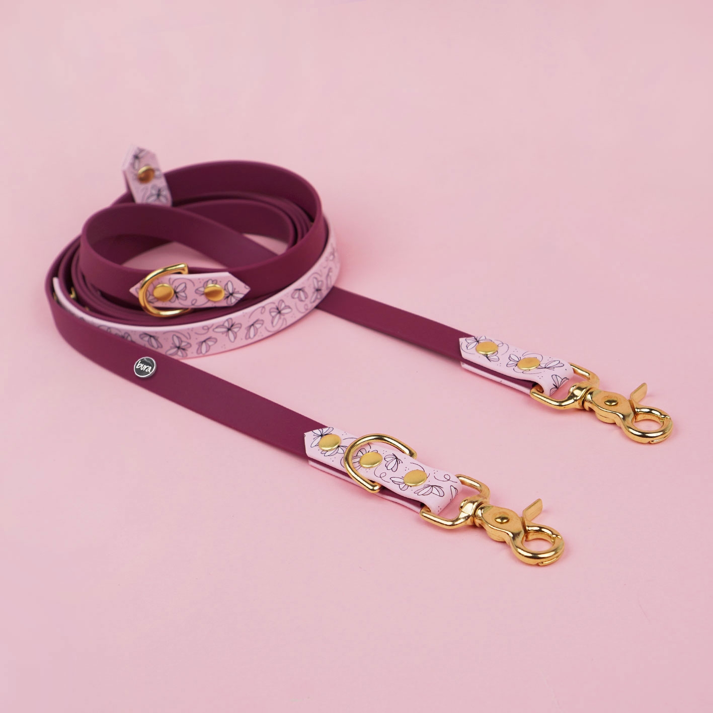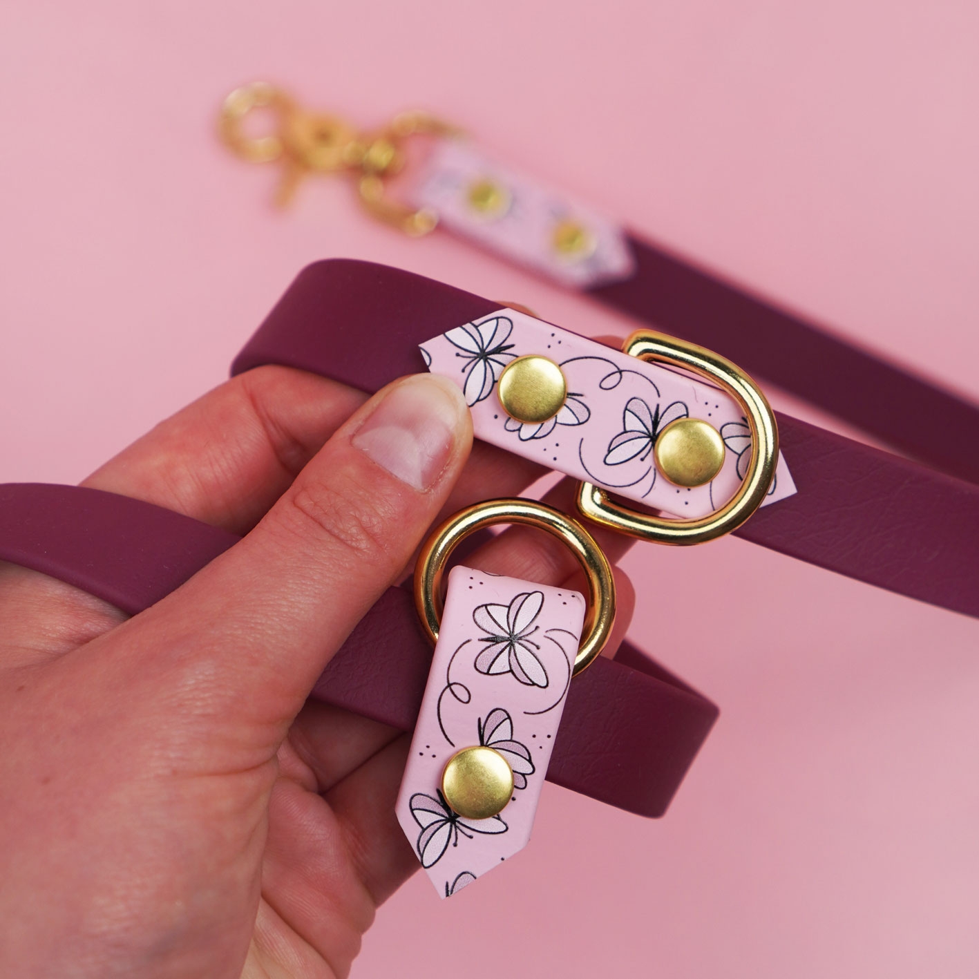 Smycz multifunkcyjna z Biothane w bordowej odsłonie z autorskim printem Motyle i pudrowo-różowymi akcentami. Regulowana, wodoodporna, z funkcją hands-free i rączką „traffic” – do spacerów po swojemu: wygodnie, lekko i na co dzień.