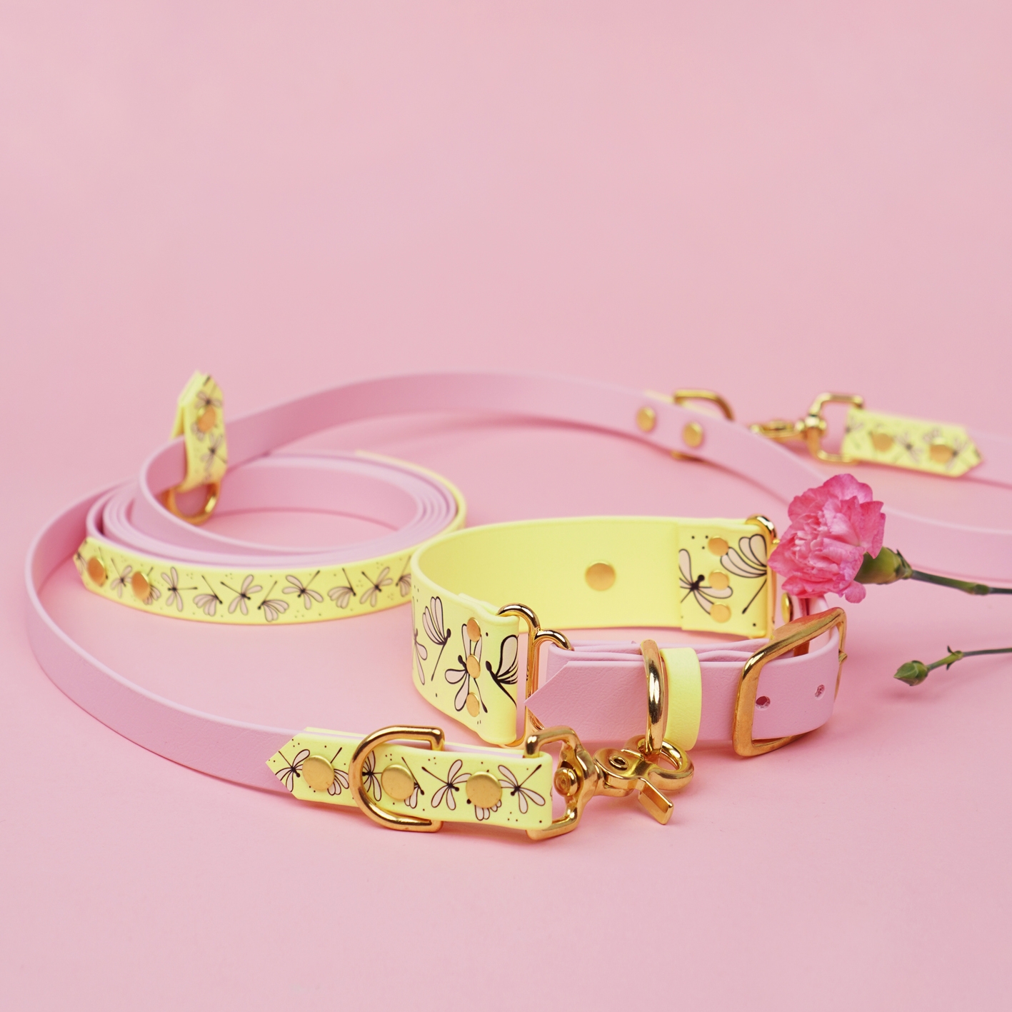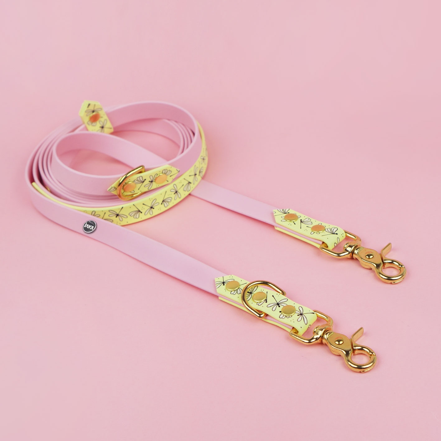 Smycz przepinana multifunkcyjna z Biothane dla psa Ważki / pastelowy żółty, pudrowy róż