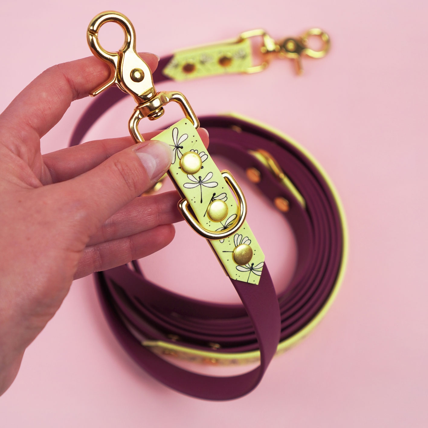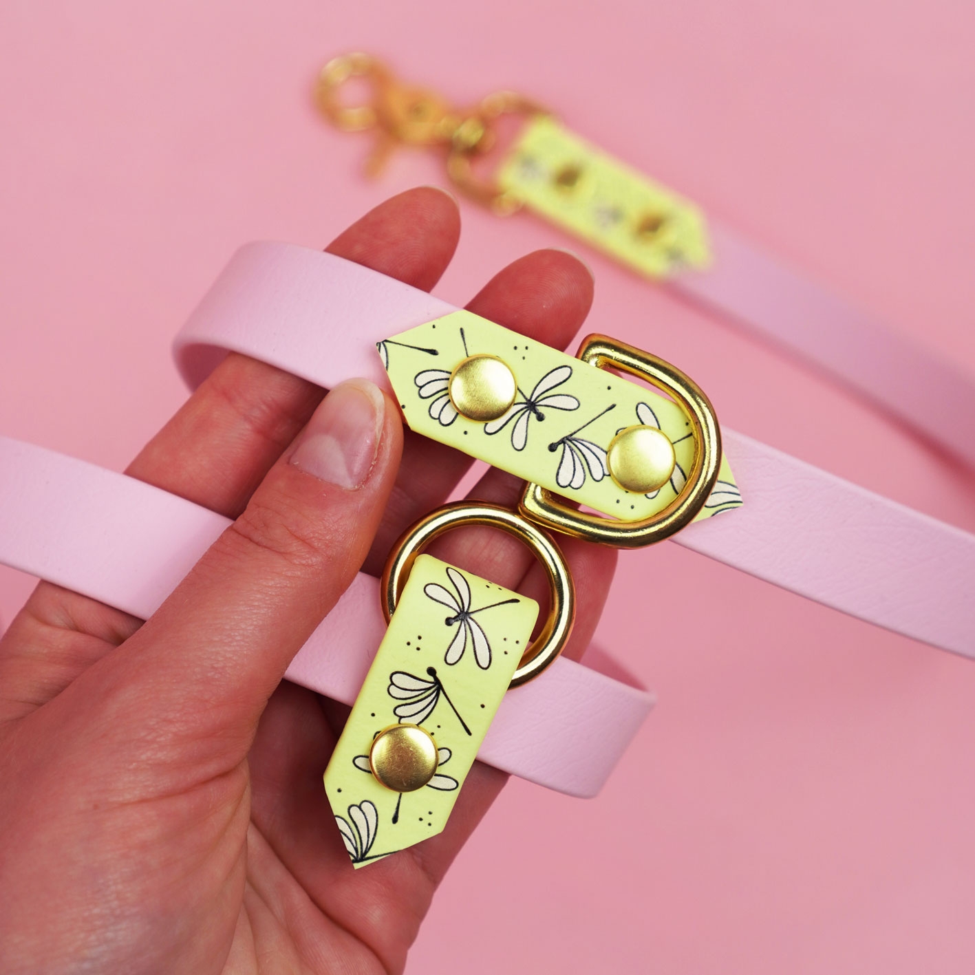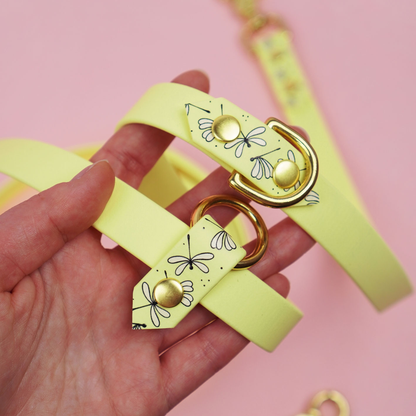 Smycz multifunkcyjna z Biothane w pudrowo-różowej odsłonie z autorskim printem Ważki i pastelowo-żótymi akcentami. Regulowana, wodoodporna, z funkcją hands-free i rączką „traffic” – do spacerów po swojemu: wygodnie, lekko i na co dzień.