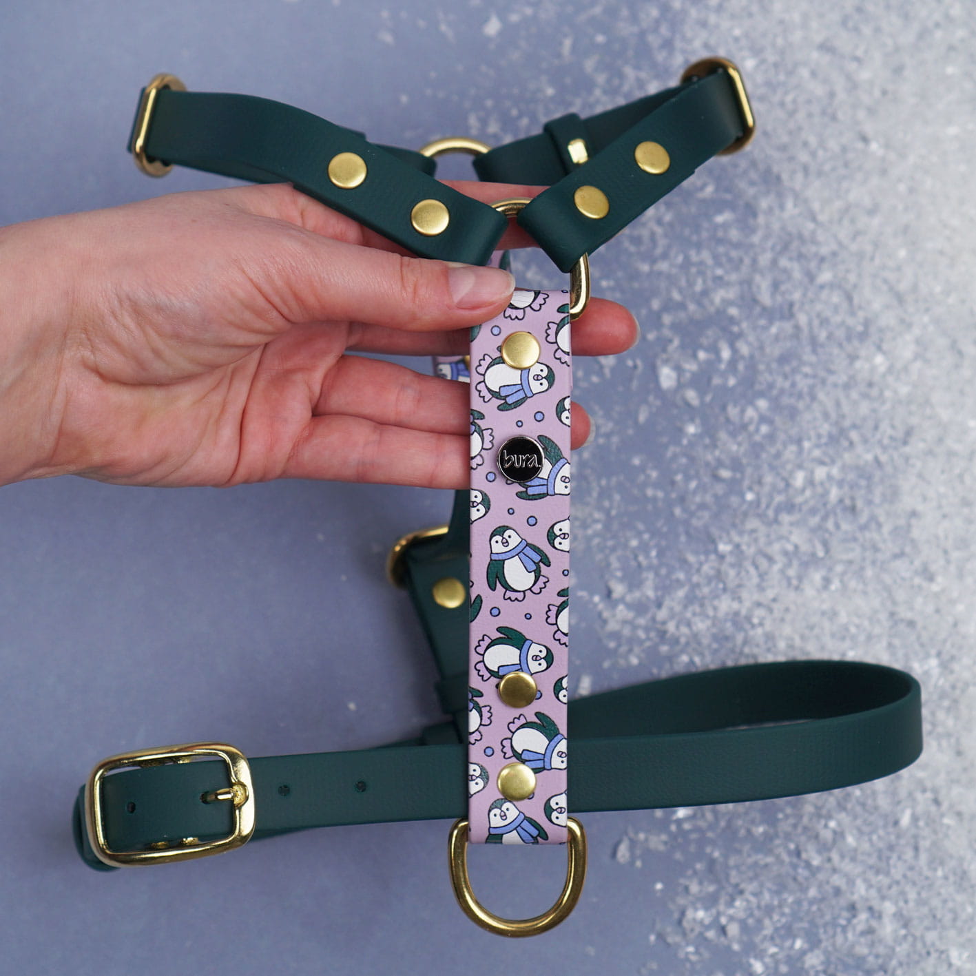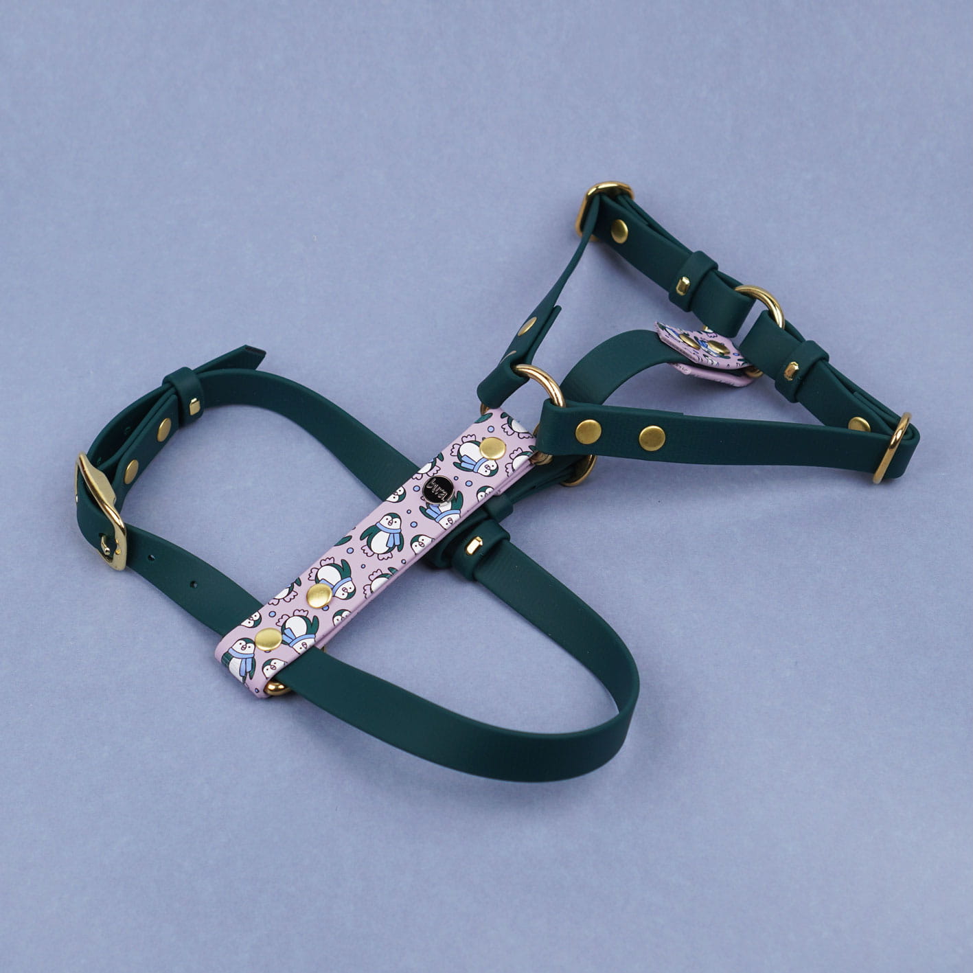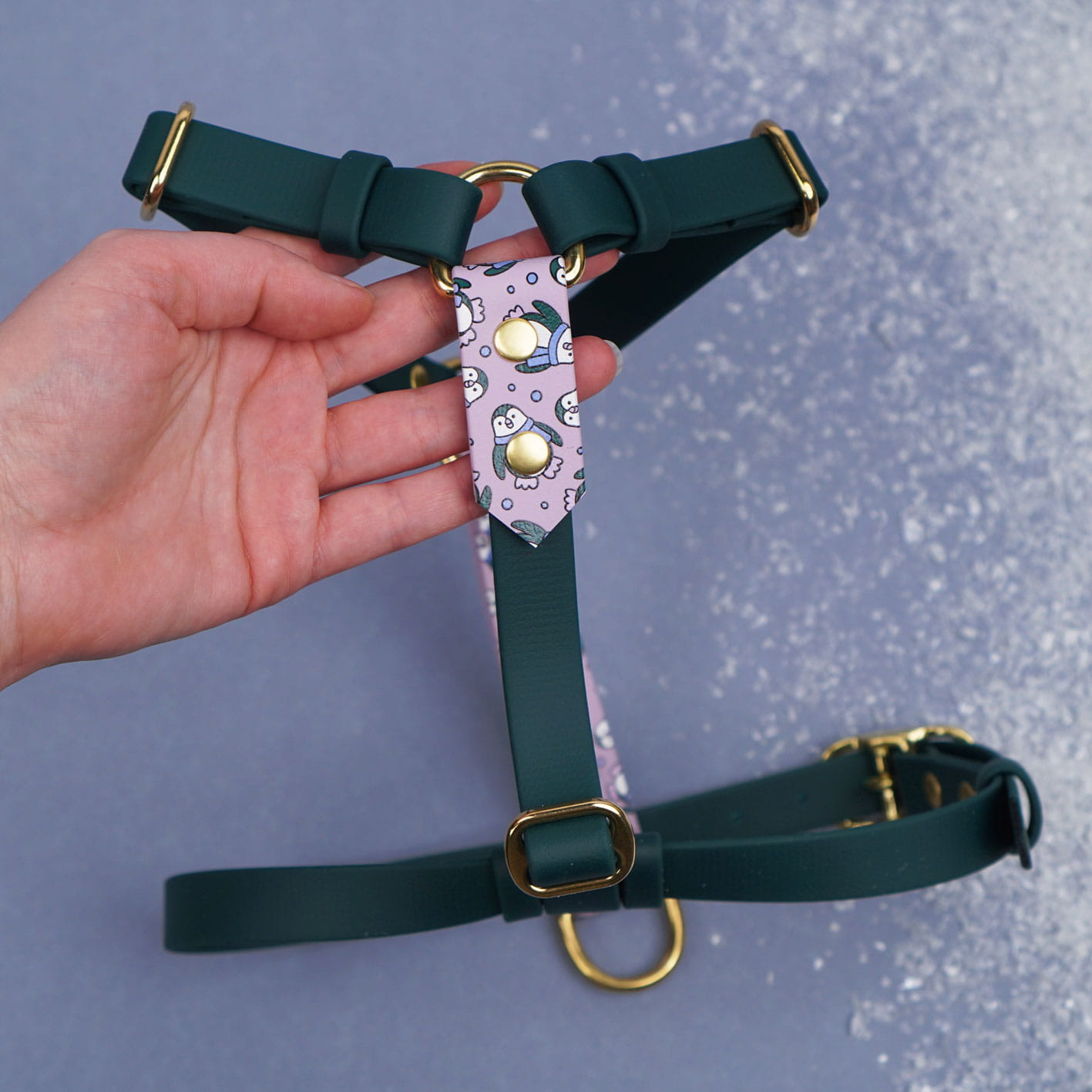 Personalizowane szelki guard z Biothane we wzór Pingwinki – wodoodporne, regulowane i wygodne. Zaprojektowane z myślą o zimowym klimacie spacerów – elastyczne, trwałe i łatwe w czyszczeniu.