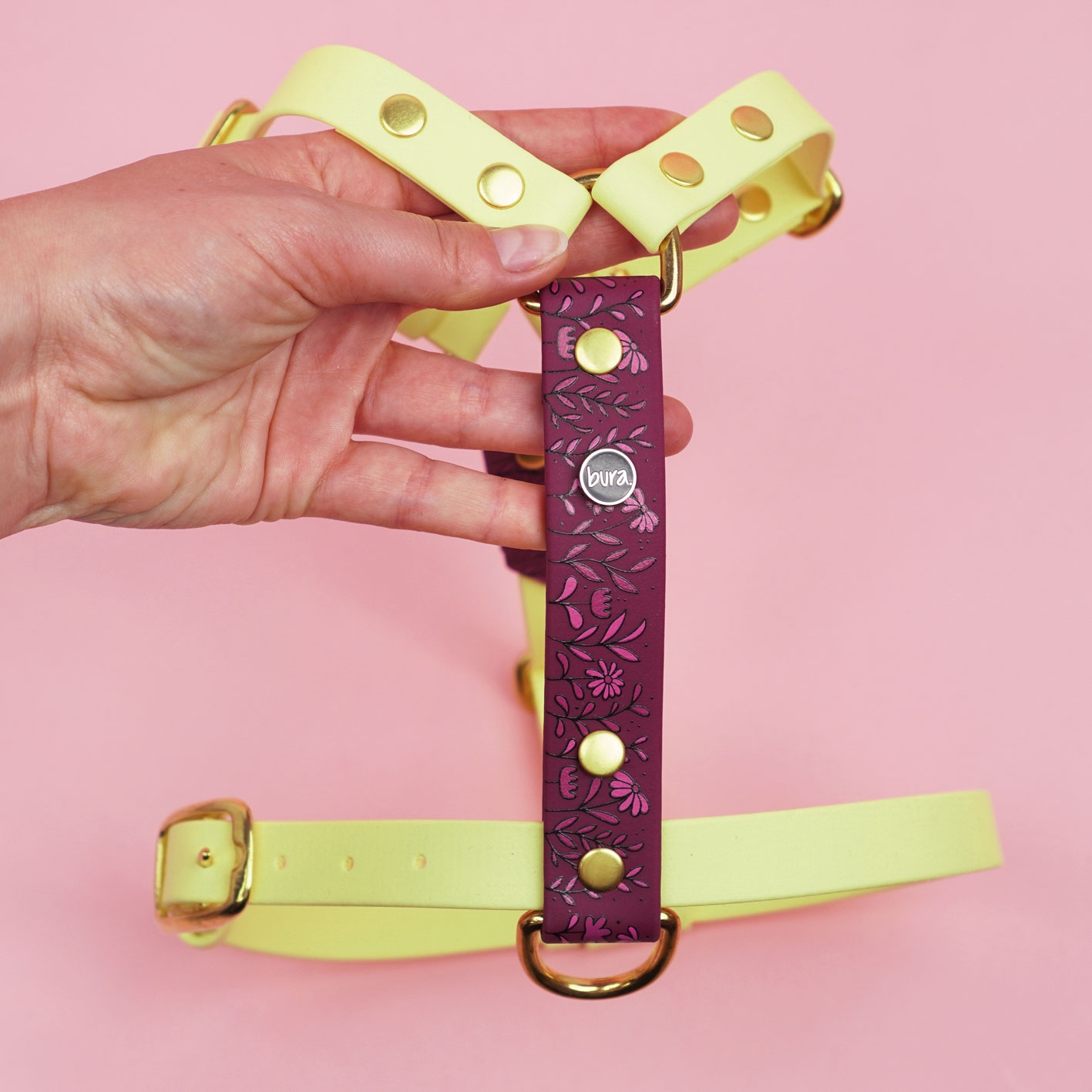 Wodoodporne szelki Guard z Biothane w pastelowo-żółtej odsłonie z autorskim wzorem Łąka i bordowymi akcentami – wygodne, regulowane i trwałe. Praktyczny wybór na codzienne spacery z psem.